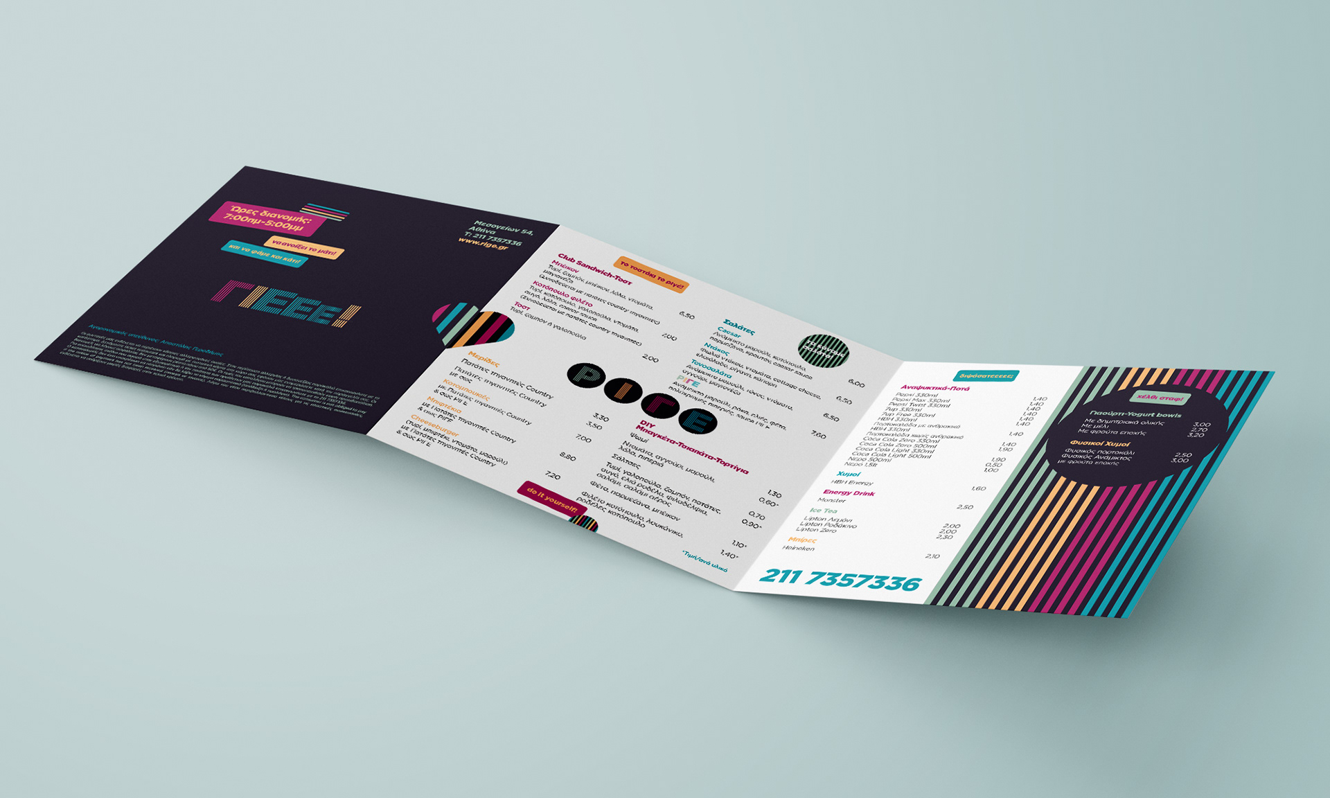 Η έμπνευση για το όνομα "ΡΙΓΕ" ήρθε αυθόρμητα και μας άρεσε. Είχε το μεγάλο πλεονέκτημα ότι ως ονοματολογία είχε μεγάλα σχεδιαστικά περιθώρια και θα έδινε γρήγορα αναγνωρισιμότητα σε μια νέα αλυσίδα εστίασης. Η λογοτύπηση ακολούθησε το concept. Τα χρώματα που επιλέχθηκαν ήταν μη προφανή, χωρίς έντονα κοντραστ, με θετική διάθεση. Η δημιουργική προσέγγιση των συσκευασιών ήταν αναπάντεχη με στόχο να σου φτιάχνουν τη μέρα. Δημιουργήθηκαν χαρούμενα stickers που περιγράφουν το κάθε είδος και κολλιώνται πάνω στα κουτιά και τα σακουλάκια δίνοντας κάθε φορά ένα μοναδικό αποτέλεσμα. Οι συνδυασμοί είναι πάρα πολλοί. Έτσι ο πελάτης είναι πολύ σπάνιο να πετύχει τα ίδια αυτοκόλλητα. Το motto "ΡΙΓΕ να ΄ναι η μέρα σου!" υπογράφει το όλο concept και είναι μια ευχή για μια όμορφη, χαρούμενη και δημιουργική μέρα, καθώς ως γνωστόν η καλή μέρα από το πρωί φαίνεται.