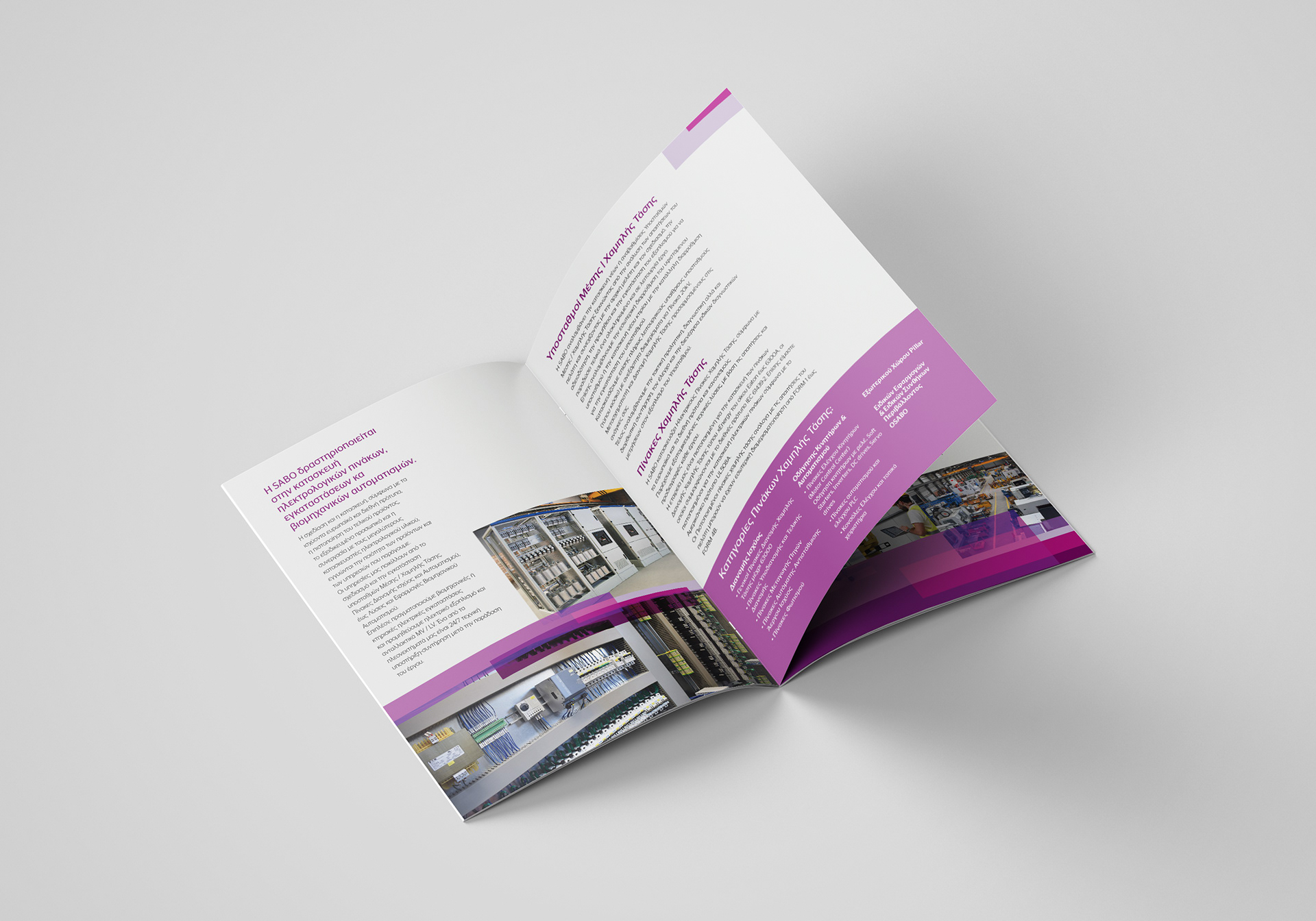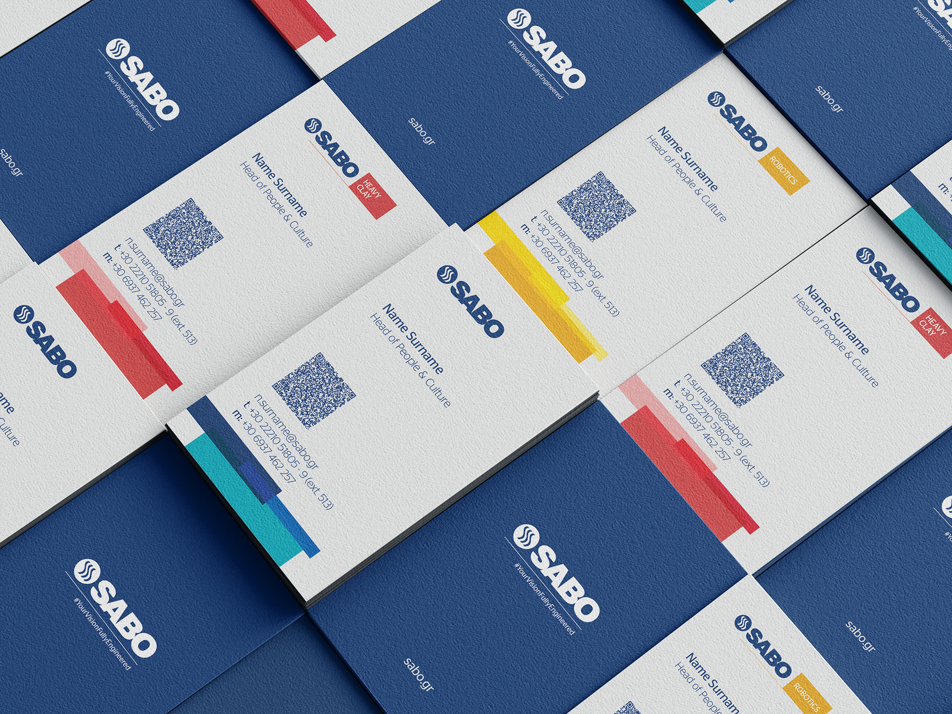 Το σύστημα visual identity βασίζεται σε ένα modular χρωματικό σύστημα που διαφοροποιεί καθαρά κάθε sector της SABO. Από το βασικό χρώμα κάθε δραστηριότητας προκύπτουν τρεις αποχρώσεις, οι οποίες συνθέτουν το χαρακτηριστικό γραμμικό design element. Το στοιχείο αυτό δημιουργεί κίνηση, βάθος και μια σύγχρονη, δυναμική αισθητική, ενώ παράλληλα εξασφαλίζει οπτική συνοχή σε όλες τις εφαρμογές — από εταιρικά brochures και roll up banners μέχρι digital εφαρμογές και social media — επιτρέποντας την άμεση αναγνώριση κάθε τομέα.